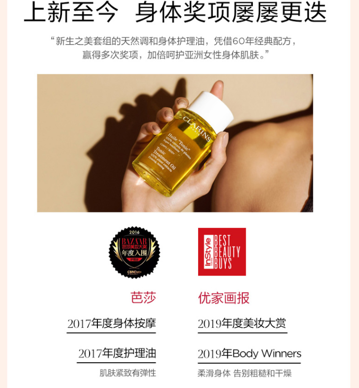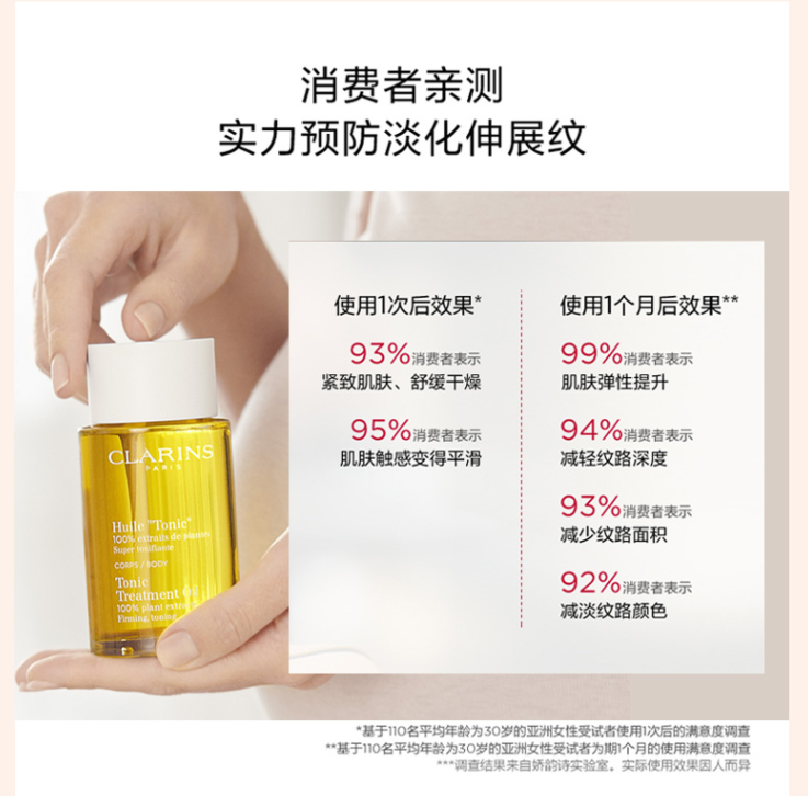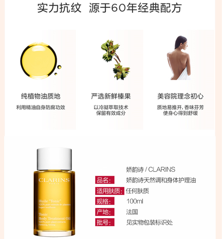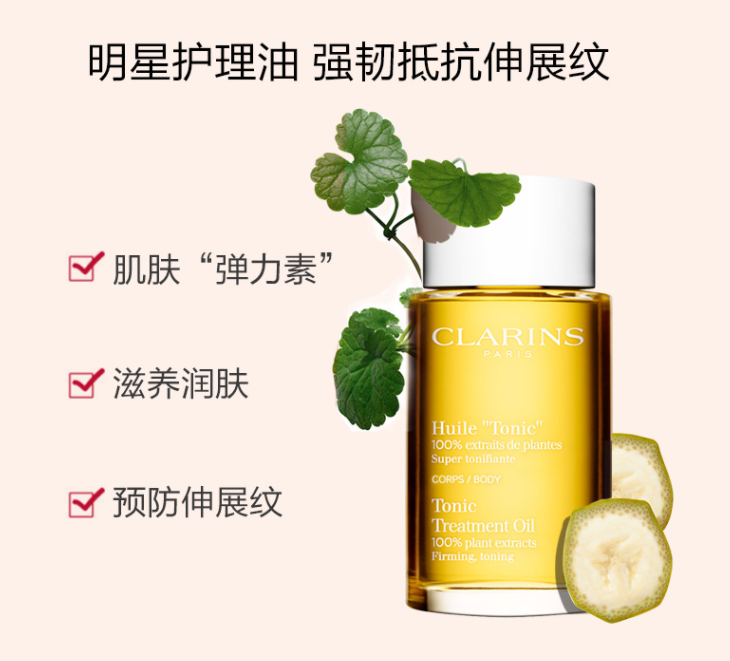 品牌: 娇韵诗(CLARINS) 商品名称:娇韵诗身体护理油 商品毛重:290.00g 商品产地:法国 功效:提拉紧致 适用人群:孕妇 类别:乳液 规格:51-100g/mL 适合肤质:任何肤质 国产/进口:进口