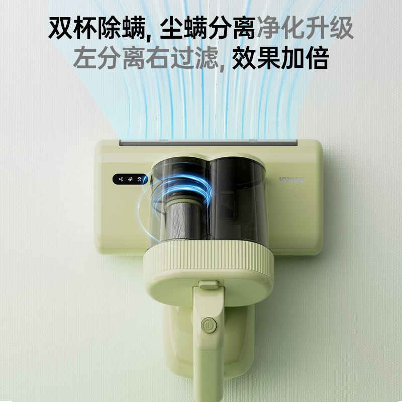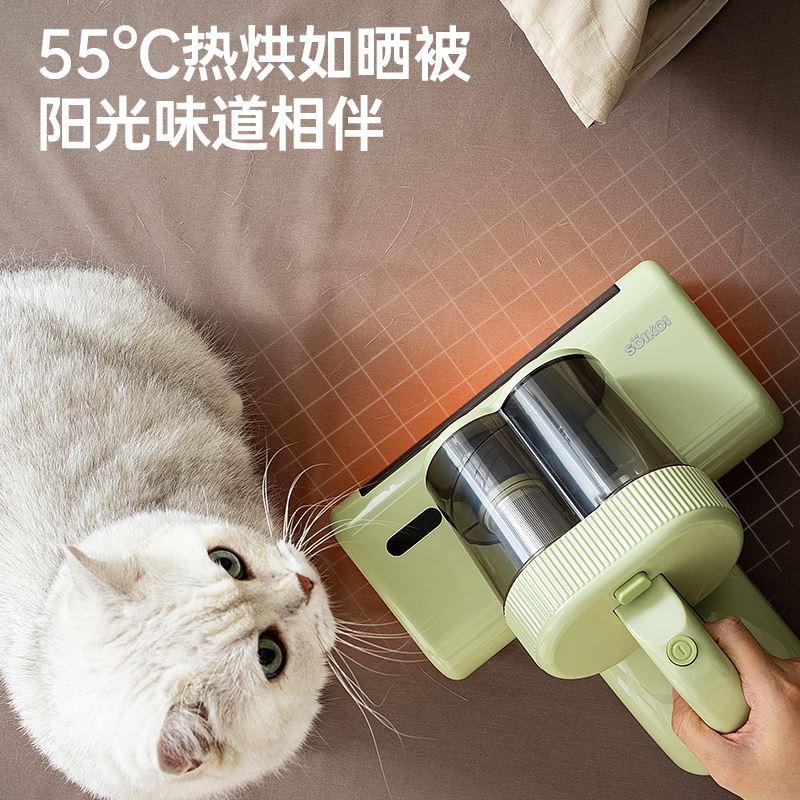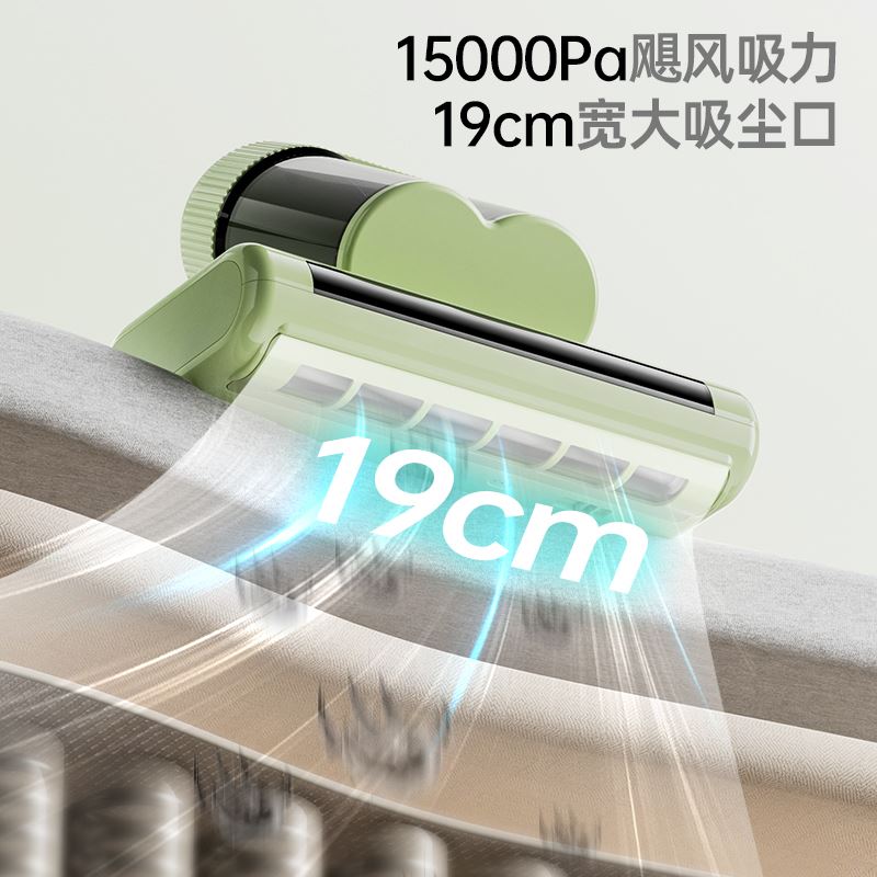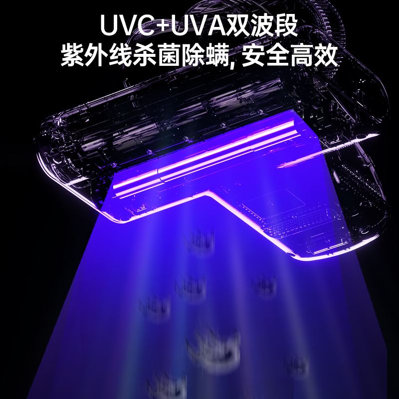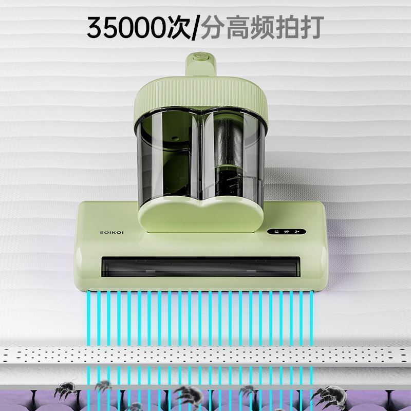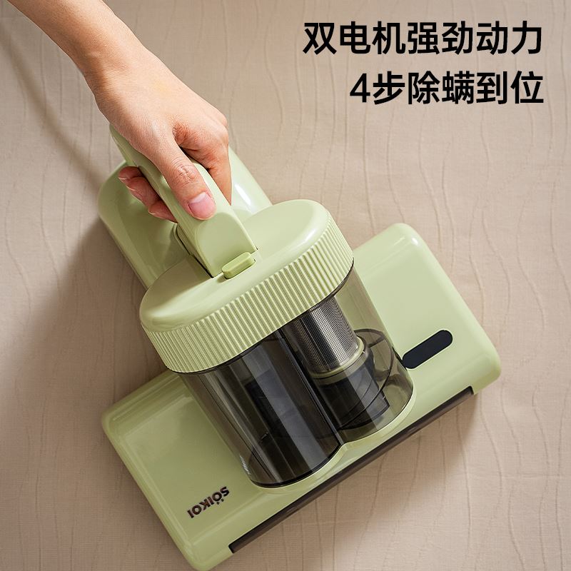 产品特点 ●双电机强劲动力,4步去螨到位, ① 35000次/分高频拍打 内置专用电机带动滚刷高速运转,强力拍打床褥深层,将隐藏的螨虫震出,让其无处遁形; ②UVC+UVA双波段紫外线去菌去螨,安全高效 物理光照技术穿透织物表层,直达深处去菌去螨,深层洁净 ③大15000Pa飓风吸力,19cm宽大吸尘口 强劲吸力搭配超宽吸口,不仅吸净床褥表面微尘,更能深入清除深藏的螨虫及排泄物; ④55°C热敷 模拟阳光暴晒环境,破坏螨虫滋生环境的同时有效除湿,告别潮湿霉味